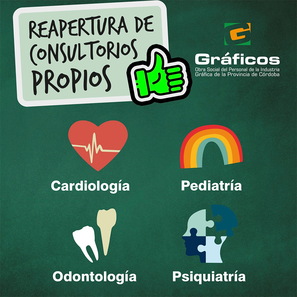 Reabrimos los consultorios propios luego de los años de cierre por el contexto de la pandemia de Covid-19, en los que debimos reestructurar nuestras formas de atención. Debés pedir turno a los teléfonos: (0351) 4236538 y 4265644. Por el momento, y hasta muy próximo aviso, las especialidades que atienden en nuestra sede (Avellaneda 54) son las siguientes: ODONTOLOGÍA Lunes y